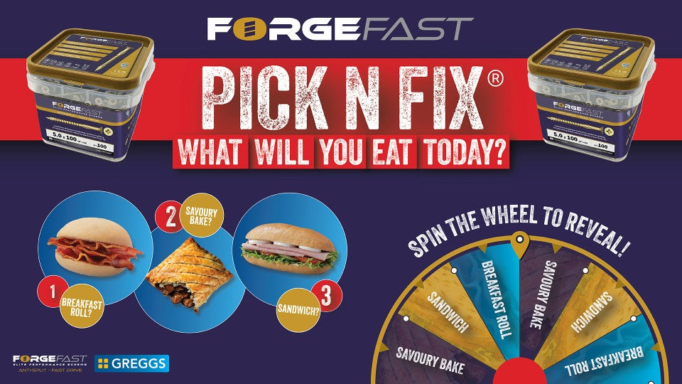 A free Greggs food item—roll, sandwich or bake—with every promotional tub of ForgeFast Pozi screws.