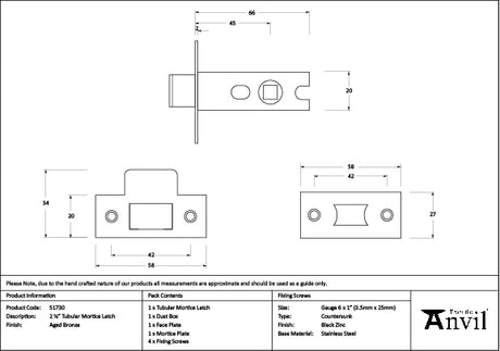 From The Anvil - Aged Bronze 2½" Tubular Mortice Latch
