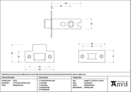 From The Anvil - Polished Bronze 2½" Tubular Mortice Latch