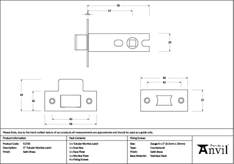 From The Anvil - Satin Brass 3" Tubular Mortice Latch