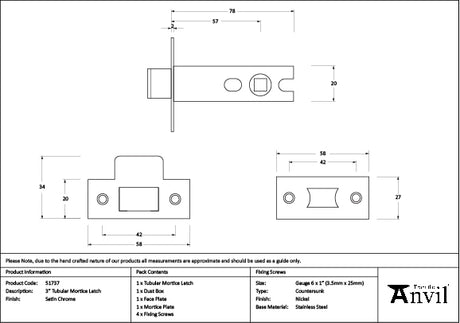 From The Anvil - Satin Chrome 3" Tubular Mortice Latch