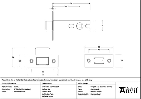 From The Anvil - Polished Bronze 3" Tubular Mortice Latch